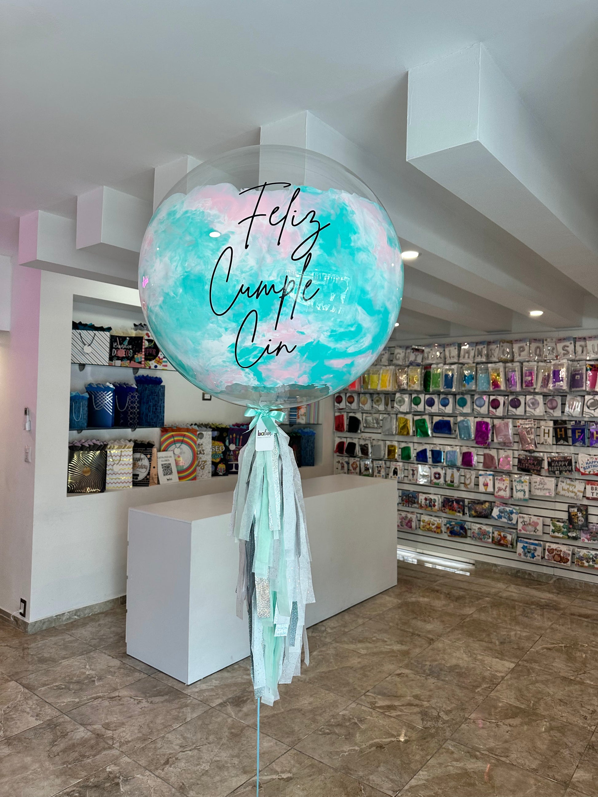 - 1 Globo burbuja (60cm aprox.) con pintura y mensaje de texto personalizado en vinil. Decorado con 1 pompón tamaño. Inflada con helio.