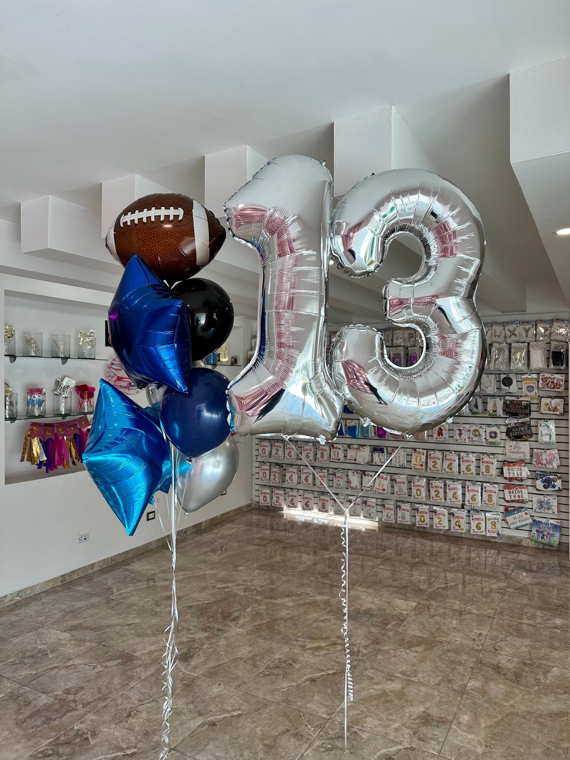 - 1 ramilletes con: 4 globos látex, 1 Estrella metálica, 1 Balón de Americano. Inflados con helio.
