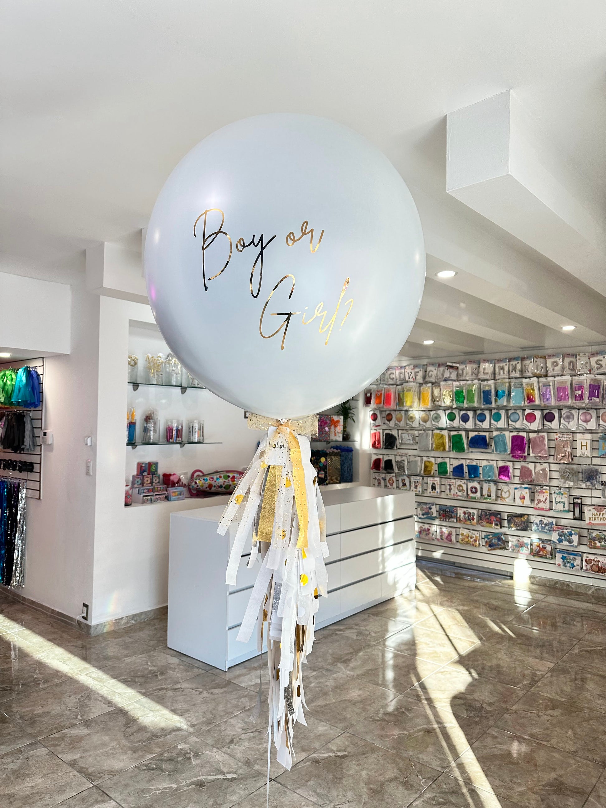 - 1 Globo látex 36" (60cm inlfado) con papelitos adentro para revelar el sexo del bebé. Inflado con Helio.