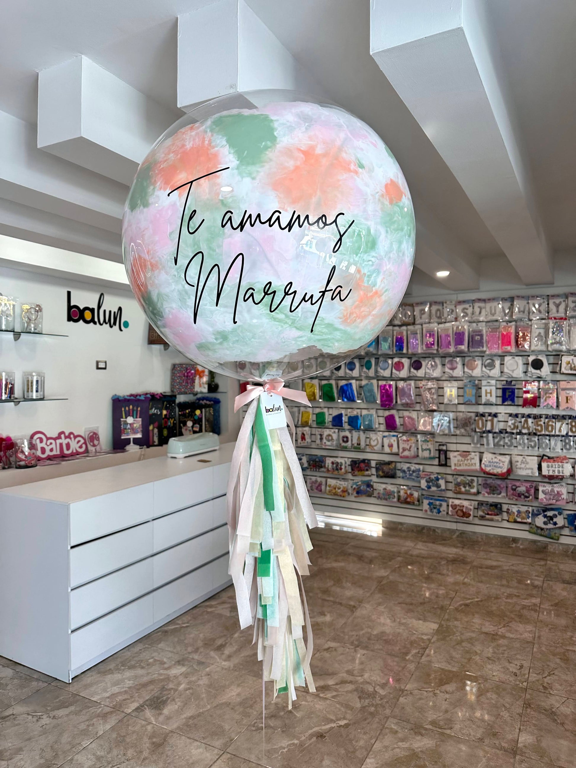- 1 Globo burbuja (60cm aprox.) con pintura y mensaje de texto personalizado en vinil. Decorado con 1 pompón tamaño grande.